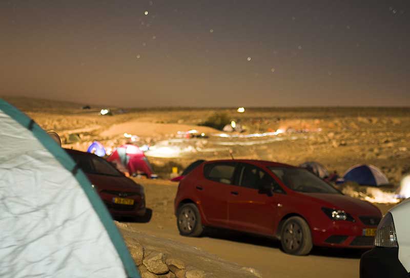 Поездка была не близкая, до места добрались уже в темноте. Когда добрались до стоянки, было такое ощущение, что пол Израиля выбралось из цивилизации в эти пустынные места: добрая сотня машин и несколько автобусов уже прибыли, и это был еще не конец. Мы еле нашли подходящие место для стоянки. Поставили палатки и приготовили ужин.