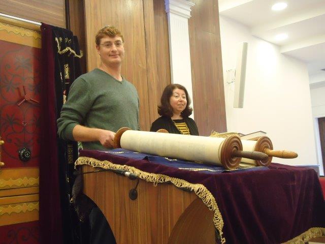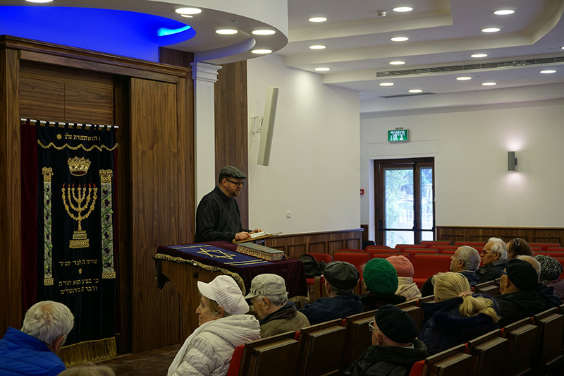 Хозяйка синагоги Хана приветствовала бывших узников Холокоста, которые впервые собрались в этом помещении. Она познакомила гостей с историей синагоги, которая была основана в 1983 году. В ней проводится еженедельное чтение Торы, отмечаются все еврейские праздники и знаменательные для евреев исторические даты. Синагогу постоянно посещают более 60 евреев с детьми и иностранные туристы. Затем с приветствием на иврите обратился к гостям служащий синагоги Йеуда. С иврита на русский язык переводила хозяйка синагоги Хана.