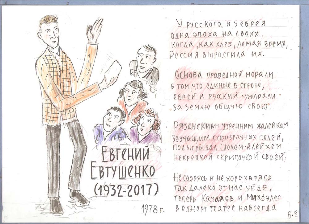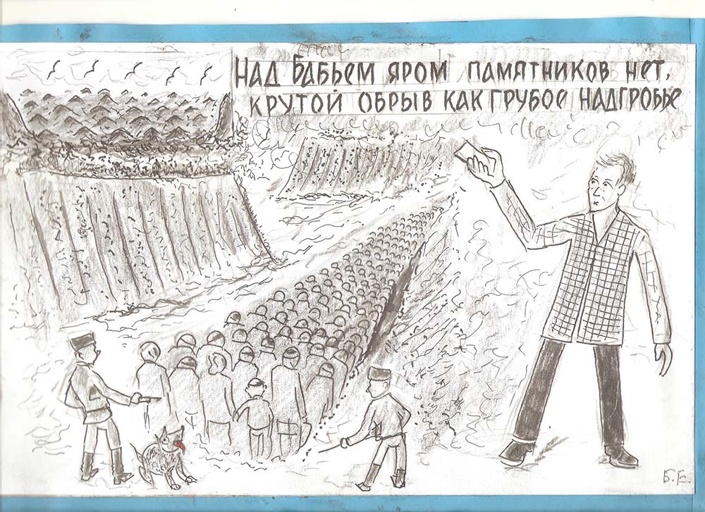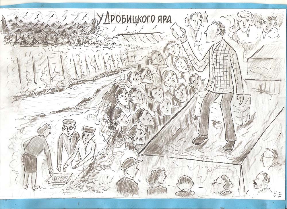 Помню, как сидя на ящике на открытой бортовой машине Евгений Евтушенко тут же сочинил стихотворение о Дробицком Яре и прочитал его при массовом скоплении людей. Тут же многие люди добровольно отдавали свои деньги на строительство «Мемориального комплекса Дробицкой Яр».