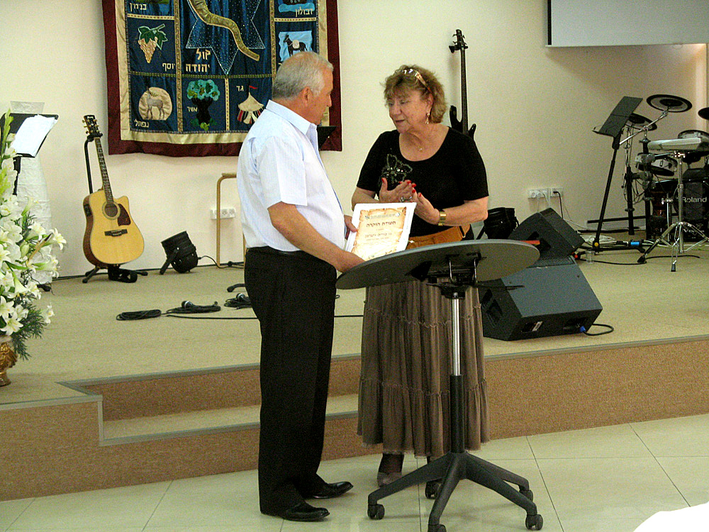 Бывшие узники благодарны тем, кто их поддерживает, кто помогает сохранять и распространять правду о Холокосте. В знак благодарности Ассоциация наградила почетными дипломами наших друзей: Бориса Гитермана и руководителя Бейт Хилель Исраэля Почтаря. Борису диплом вручила Гита Койфман. Исраэль в этот день находился за границей и его диплом Гита передала Авиэлю, молодому сотруднику Бейт Хилель.